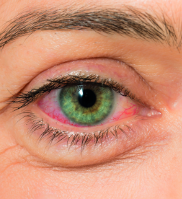 překrvené, suché, zdegenerované tkáně oka, neostrý zrak